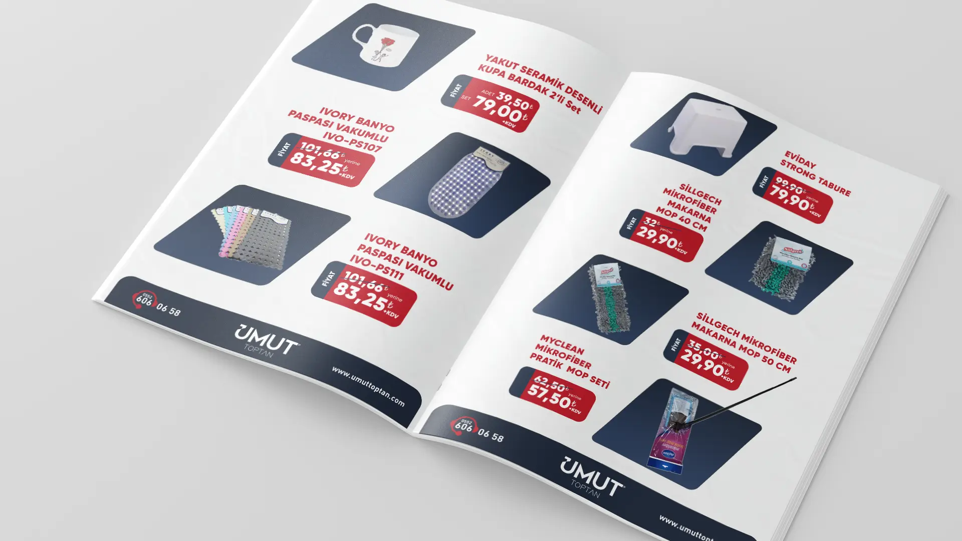 Umut Toptan için hazırladığımız broşür tasarımı, markanın profesyonel duruşunu yansıtmak üzere özenle hazırlandı. Görsel ve metin dengesi ile hedef kitleye etkili bir şekilde ulaşılarak, kurumsal iletişim güçlendirildi.